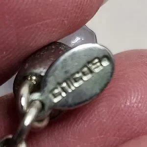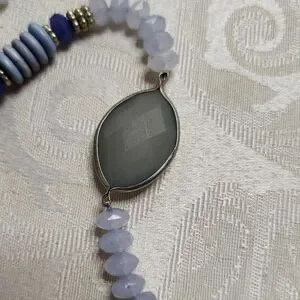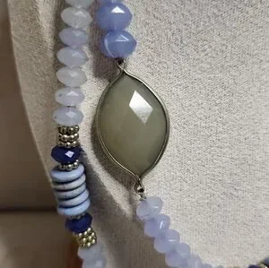 Elegant vintage 1990s CHICO’s extra long statement, necklace, crafted with a mixture of faceted blue-no no toned beads, striped disc beads, and large marquise shaped accent stones in a soft green grey hue. The combo of textures and colors creates a fluid, artistic look characteristic of Chico‘s early statement collections.
