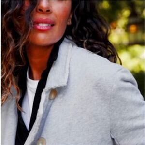 Keywords: belfast, triple fleece, trench coat, pea coat, jacket, double breasted, gray, grey, button up, button front, cozy, comfy, comfortable, stretch, casual, classic, travel, away, preppy, prep, timeless, relaxed, everyday, boho, bohemian, designer, closet staple, capsule, elevated basic, designer, quiet luxury, spring, summer, fall, winter