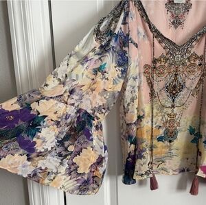Vibrant floral Camilla camisole with intricate embellishments. Features a mix of colors and patterns. Flowy sleeves add elegance.