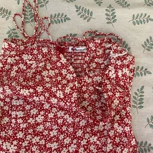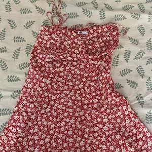 Charming red floral dress. Features a fitted bodice and spaghetti straps. Perfect for casual outings.