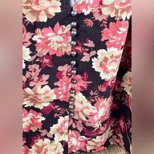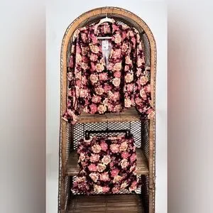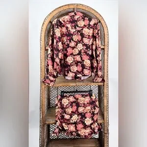 Free People “Elodie” two-piece set featuring a retro-inspired floral print. Includes a button-front blouse with a V-neckline and slightly exaggerated long sleeves, paired with a high-rise mini skirt with ruching throughout and a ruffled hem. The skirt is designed to be convertible and can also be styled as a tube top.