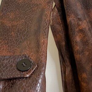 Embrace the sleek lines of this long-sleeved coat. Crafted from supple faux-leather fabric, this piece offers a put-together look on the cutting edge of style trends. Long straight sleeves and a notched collar accentuate the straight silhouette of this elegant animal print coat.