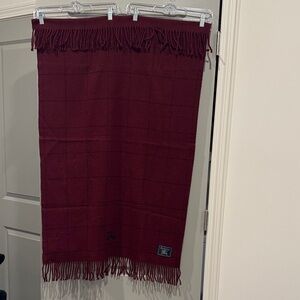 Stylish Burberry wool scarf in burgundy. Features subtle plaid design and fringe edges.