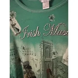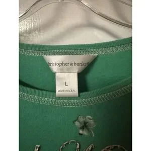 This Christopher & Banks women's size L Irish theme cotton shirt features a classic and retro design with a round neckline, pullover closure, and 3/4 sleeves. Made of 100% cotton knit fabric, the shirt is machine washable and showcases green color with sequin accents. Perfect for casual occasions, this basic t-shirt in a regular fit is a stylish and comfortable choice for any woman's wardrobe. Proudly made in the United States, this shirt is a versatile piece that captures the essence of Irish heritage.
