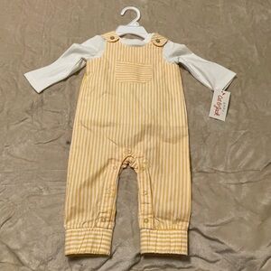 Super cute 2-piece set from Cat & Jack features yellow striped overalls and plain white long sleeve shirt. Overalls include button straps, a front pocket, and snaps on the legs for easy diaper changes. Great for springtime pictures!