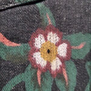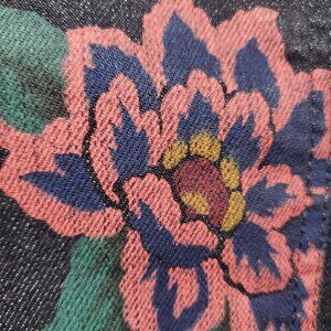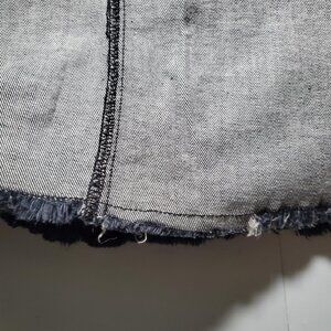 Black Denim (98cotton/2spandex) with floral pattern on denim - zip fly and true waist with raw hem - pics of skirt inside-out to show pocket details as well as stitch on raw hem (ensures that fraying does not continue) - really cute skirt and denim is heavy enough (10.7ozs) that can be worn in summer or fall with tights - see all pics for measurements - all horizontal measurements take 2 pics each - used and in excellent condition with no issues