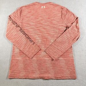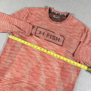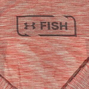 The product is an Under Armour men's shirt in size XL, featuring a light heather pink color with a solid pattern and logo accents. This long sleeve shirt has a crew neck and is made of polyester material, suitable for all seasons including winter, summer, fall, and spring. Part of the Under Armour HeatGear product line, this fitted shirt is machine washable and designed for regular fit, making it ideal for fish hunters and outdoor enthusiasts looking for comfort and performance.