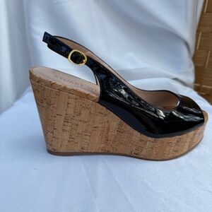 • Elegant black patent leather wedges with a cork platform.