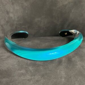 A signature Alexis Bittar design returns, this luminous Lucite collar necklace has a sleek translucent hand-sculpted silhouette that hugs the neckline with a glowing hand-painted aurora hue.