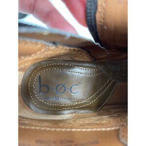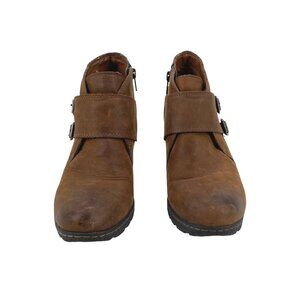 Chic brown leather ankle boots by Bøc Born Concept with dual buckle accents and inner side zippers for easy wear. Features a comfortable stacked heel and durable construction. Faint scuffs on leather near toe box and minor wear on outsole.