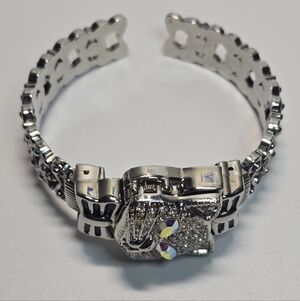 Varsales women's silver-tone cat-face cuff bracelet watch with rhinestone and AB crystal embellishments. Will need a battery.