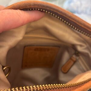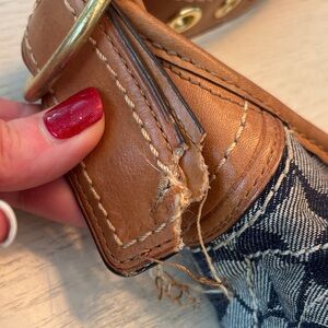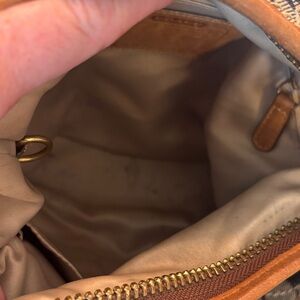 Elegant hobo bag with floral design. Features blue and tan colors. Ideal for daily wear. This is a well-loved bag. See flaws in photos. RARE bag. Has so much more life in her. No stains on outside other than bottom wear.
