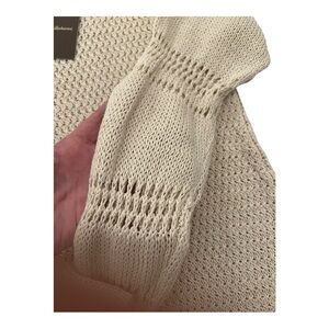 This lightweight sweater has a shark-bite hem, drop shoulders and a pretty crocheted look, especially in the sleeve detail.