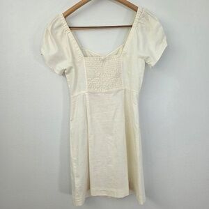 Made of a linen and cotton blend, this retro-inspired mini dress has short puff sleeves and princess seams for a body-skimming fit. Perfect to pop on for a picnic in the park.