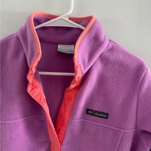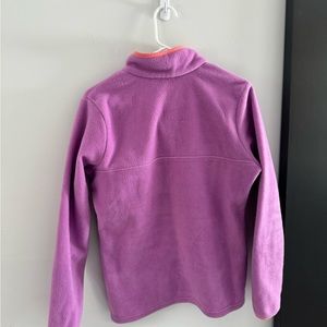 Cozy fleece sweatshirt. Features a vibrant purple body. Accented with pink trim. Perfect for casual outdoor wear. Greta to layer.