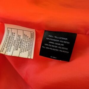 Puffer jacket with a hood and pockets, that snaps and zips closed, in a burnt orange/red color. In good condition though could use cleaning. It measures pit to pit 21 1/2, length 25.