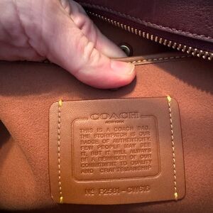Sophisticated Coach satchel in dark burgundy leather. Features elegant design and sturdy handles. Ideal for everyday use