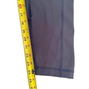 High-waisted athletic leggings, featuring side pockets and waist band pocket for essentials like phone or keys. Color is a sage gray. Polyester/spandex blend.