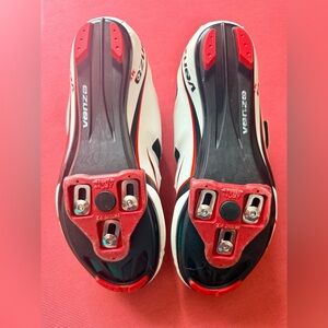 Comfortable, breathable cycling shoes, compatible with spin bikes requiring a Delta Clip (e.g., Peloton). White and black with red accents. Minimal wear on uppers, visible wear on bottom (see photo). Worn by a woman - great for people with wider toe box.