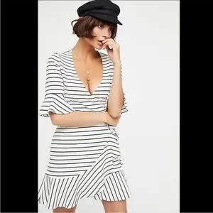Elegant black and white striped wrap dress with ruffle sleeves. Perfect for any occasion.
