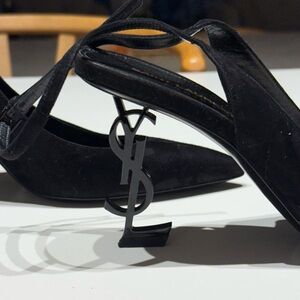 Chic Saint Laurent heels with a pointed toe. Sleek black design with slingback style. Perfect for elevating any look. Size 9.5 and fit true to size !