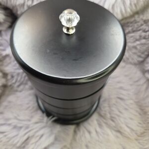 Bombay 4-drawer tiered jewelry box in black. Features a black and white zebra print fabric lining, four circular swing-out drawers, a clear crystal gold top knob, and a spiral design around the central pole. Handmade and handcrafted with four velvet protective feet. Offers ample storage in a compact design.