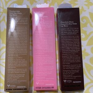 -Set of three lip gloss keychains by TONYMOLY. Includes Frosted Milk, Strawberry Shortcake, and Chocolate Glaze flavors! Retail for $12 each!