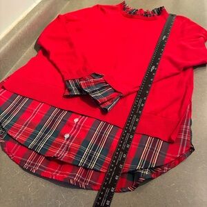 Stylish red sweater with plaid accents. Crew neck design. Perfect for layering.
