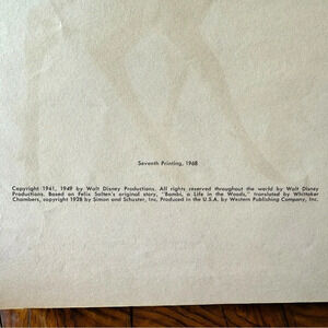 This 1968 vintage hardcover edition of Disney’s Bambi is a delightful addition to any collection. The book is in vintage used condition, showing some wear, including damage to the corners and spine. Despite the wear, the beautiful colored illustrations throughout the book are vibrant and well-preserved, making it a nostalgic treasure for any Disney fan or vintage book collector.