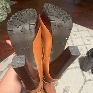 Elevate your style with these chic tan leather high heel boots. Perfect for any occasion, these boots offer both comfort and elegance. Women’s size 6.5 in great, used condition! Minor wear on the inside (as pictured). Leather, upper man made.