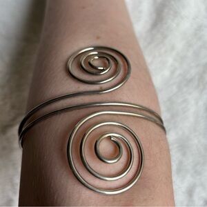The polished silver-tone metal features a cool double spiraldesign. It easily slides onto the upper arm or can be worn as a chunky bracelet.