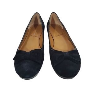 Tahari "Rob" black suede leather wedge shoes with bow accent on the front. Low 1.25" wedge heels. Non-skid outer sole. Gentle wear, generally in very good pre-owned condition. Size 8.5 M.