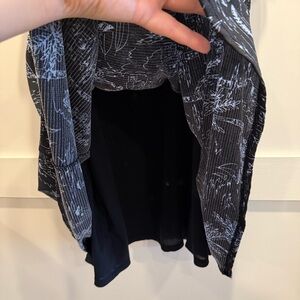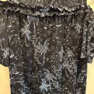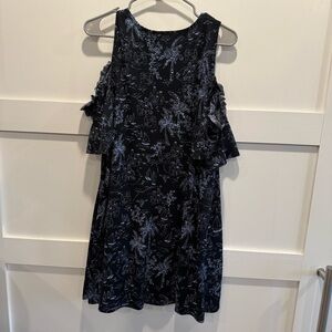 Stylish cold shoulder dress with unique graphic design of palm trees, boats/tropical vibes. Perfect for many occasions. Lauren Conrad brand, Size XL. Body material made of 99% polyester, 1% spandex. Lining made of 100% polyester. Good condition, no noticeable flaws.