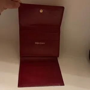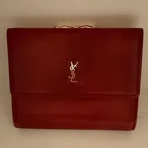 Elegant red leather clutch with gold YSL logo. Perfect for evening events.