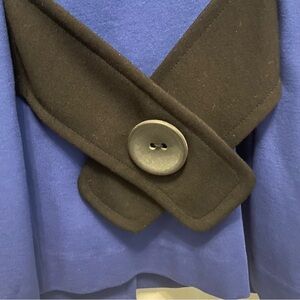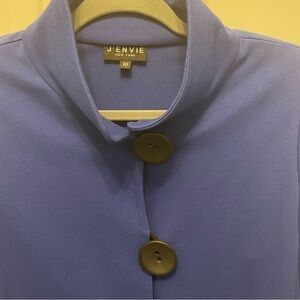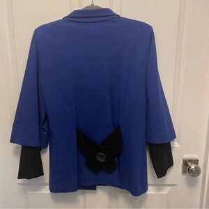 Loose fitting, almost swing style, blazer jacket from J’Envie. Size 10. Faux black sleeves attached. No pockets. three large black buttons. 20” pit to pit and 27” length. Non-smoking home.