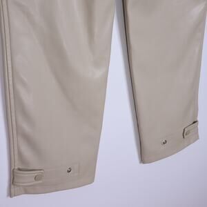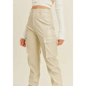 Beige vegan leather cargo pants with a soft fleece lining. Designed with a button and zipper closure, two side pockets, and two cargo pockets. The straight slim leg includes adjustable ankle snaps that allow you to style the fit as more tapered or straight.
