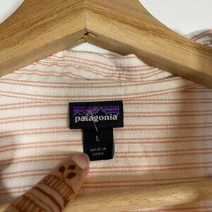 Keywords: Patagonia shirt, Organic cotton hemp blend, Striped button down, Casual outdoor wear, Eco-friendly clothing, Long sleeve, Collared shirt, Men’s size L