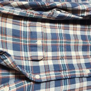 Cotton flannel shirt in a mineral blue plaid. No signs of wear- looks new! Chest is approx 22 inches, length is approx 28 inches. Excellent condition.