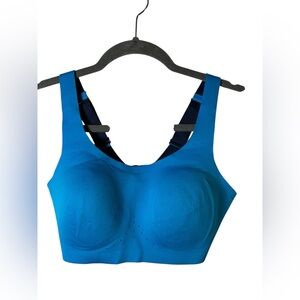 Brooks Dare Scoopback Run Bra in a vibrant blue and navy colorway, size Small. Engineered for high-impact support with molded cups, breathable laser-cut perforations, and adjustable straps that convert from scoop back to racerback. Features a secure back hook-and-eye closure and soft, chafe-free fabric. Ideal for running, training, or high-intensity workouts. Gently used and in excellent condition.