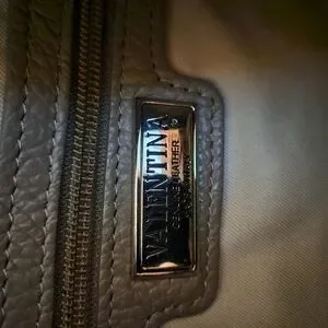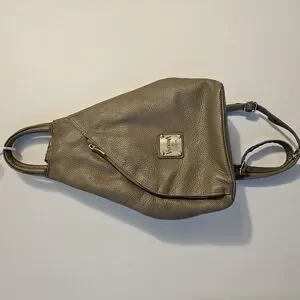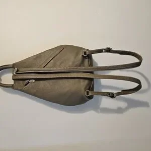 Elegant taupe leather bag perfect for any occasion. Features a sleek design with a secure zip closure.