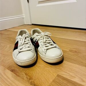 Stylish Gucci sneakers with classic navy blue and red stripes. Comfortable and trendy for everyday wear.
