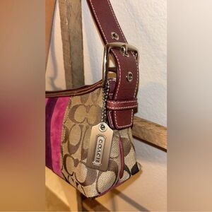 Stylish Coach shoulder bag with signature pattern. Features bold pink stripe. Perfect for any occasion.