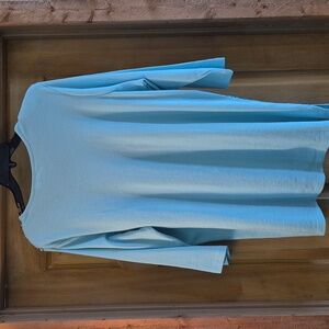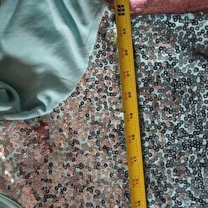 Chic sky blue or aqua tee shirt with sequins. Top start out in silcer and transitions into a darker aqua teal color. This is a stunning tshirt. It has shoulder pads too! So comfy and stylish. Ideal for everyday style or for evening out.