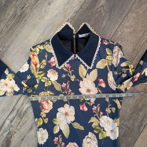 Alice + Olivia long sleeve floral. Features a navy base with a floral pattern. White lace peter pan collar adds a classic touch. gorgeous dress in excellent pre-loved condition. minor flaw near shoulder (see photos for flaws and measures).
