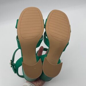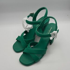 Like New Kenneth Cole Lessia Heels. These are a women's 9.5. Medium width. Kelly green color throughout. Tan soles. 3.5-4" heel. Leather upper. Cute!