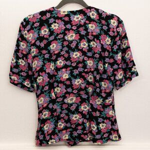 Vintage 80s La Belle Floral Blouse S | Rose Button Black Top Made in USA