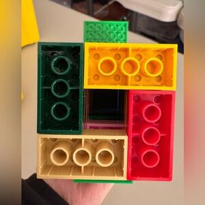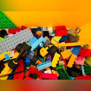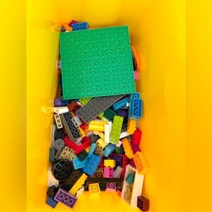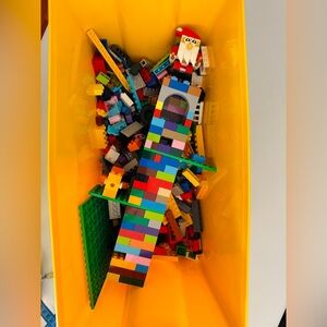 Assorted LEGO bricks and pieces in a large yellow LEGO storage box, weighing 3 lbs. 12.5 oz (with box). Includes colorful bricks, wheels, and specialty parts for endless builds, plus a festive 12" tall LEGO Santa tower with 2" x 2" base—perfect for the holidays. Box has light scuffs but closes securely. A fun starter set, collection refill, or holiday gift!