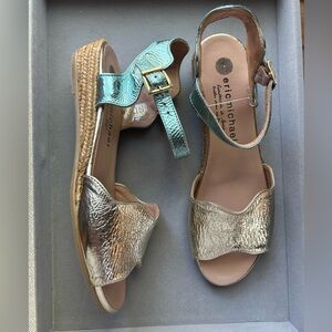 New, never worn, only tried on. Size 38 - made in Spain. Wedge is 1”. Teal and Rose Gold metallic. No box