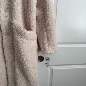 Luxurious and warm trench coat. Features a plush texture. Perfect for chilly days. Includes convenient pockets.