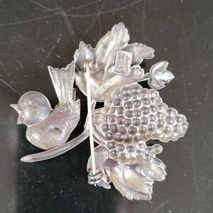 vintage Sterling Silver pin of a bird on a branch with grapes. Lang made Jewelry, from the 1940's to the 1970's. This piece is from the early years. 1940 to 1950s. It weighs 5 grams and measures 2"x2".